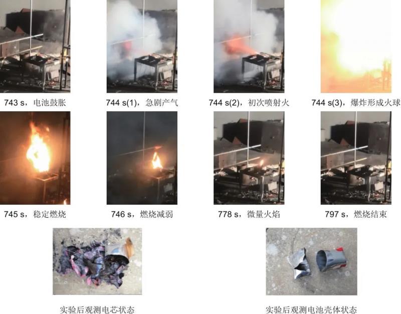 鋰離子單體電池過充實(shí)驗(yàn)現(xiàn)象見圖4。實(shí)驗(yàn)過程可大致分為3個(gè)階段:第一階段為電池殼體鼓脹變形階段,從實(shí)驗(yàn)開始至743 s時(shí)可見電池殼體變形,電池試樣周邊散逸少量白色煙氣。這一階段,過充僅導(dǎo)致電池內(nèi)部材料發(fā)生各類反應(yīng)并產(chǎn)生一定的氣體,電池殼體內(nèi)部壓力增大導(dǎo)致電池出現(xiàn)外觀鼓脹變形。少量白色煙氣的產(chǎn)生主要是因?yàn)殡S著電池過充釋放出一定的熱量,導(dǎo)致電池外殼及不燃隔熱材料等產(chǎn)生熱分解。第二階段射流火及爆炸階段,持續(xù)時(shí)間僅為1 s。實(shí)驗(yàn)進(jìn)行至744 s時(shí)安全閥打開,在1 s時(shí)間內(nèi)電池釋放大量白色煙氣、急劇噴射火焰并瞬時(shí)發(fā)生爆炸,形成巨大火球。由于實(shí)驗(yàn)最高電壓上限設(shè)置為10倍額定電壓(37 V),在較高的截止電壓過充下,電解質(zhì)、電極以及集流體的電阻顯著增大,電池動(dòng)力學(xué)性能及熱穩(wěn)定性顯著降低,內(nèi)部化學(xué)反應(yīng)增強(qiáng)。隨著持續(xù)過充電池內(nèi)部反應(yīng)的加劇,產(chǎn)氣量不斷增大導(dǎo)致電池內(nèi)部壓力也急劇增大,僅安全閥破裂泄壓難以實(shí)現(xiàn)電池內(nèi)部和外部的平衡,因而發(fā)生電池殼體撕裂出現(xiàn)爆炸。電池內(nèi)部熱失控反應(yīng)產(chǎn)生的可燃?xì)怏w和電解液與空氣混合后被引燃,形成初次射流火并伴隨著爆炸形成了強(qiáng)烈的火球。第三階段為穩(wěn)定燃燒階段,爆炸后能量得到泄放,支架上電池內(nèi)部殘余的電解液及可燃材料仍持續(xù)猛烈燃燒,火焰持續(xù)53 s后完全熄滅。實(shí)驗(yàn)后觀測(cè)圖片可見,電芯中銅箔和鋁箔表面的所有物質(zhì)均已過火,電池爆裂位置并未發(fā)生在安全閥附近,而是在位于電池殼體約1/3處完全撕裂,進(jìn)一步表明爆炸瞬間安全閥的破裂不足以實(shí)現(xiàn)電池殼體內(nèi)外壓力平衡,在744 s時(shí)電池內(nèi)部產(chǎn)氣壓力大大超過了安全閥設(shè)定的閾值。