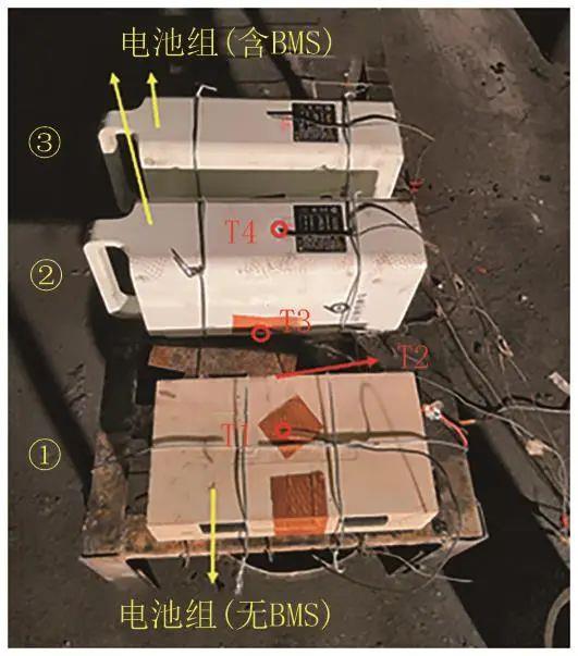 為了考察多個(gè)鋰離子電池組在一定間距下相互引燃的情況,采用3個(gè)鋰離子電池組在間距6.5 cm的條件下開展實(shí)驗(yàn),布置如圖3所示。實(shí)驗(yàn)時(shí)將3個(gè)電池組放置于鐵支架上,其中1號(hào)不帶BMS的電池組水平放置,安全閥方向朝向2號(hào)電池組,2號(hào)、3號(hào)電池組側(cè)立放置,安全閥方向朝上。采用4支熱電偶測(cè)量電池表面溫度及煙氣、火焰溫度。實(shí)驗(yàn)仍在爆炸洞內(nèi)完成,在室溫條件下,以27 A(2 C)電流對(duì)1號(hào)鋰離子電池組進(jìn)行恒流過充,最高電壓上限設(shè)置為80 V。