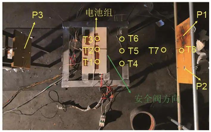實(shí)驗(yàn)現(xiàn)場(chǎng)條件與鋰離子單體電池實(shí)驗(yàn)條件相同,實(shí)驗(yàn)布置如圖2所示。實(shí)驗(yàn)時(shí)采用8支熱電偶(T1~T8)測(cè)量電池組表面殼體溫度以及火焰溫度。T1、T2、T3位于電池表面上,其中T2位于電池殼體中心處,向兩側(cè)偏移15 cm分別為T1和T3,T1靠近接線端。T4、T5、T6、T7、T8與電池的最短距離分別為10 cm、10 cm、10 cm、20 cm、45 cm。設(shè)置3個(gè)壓力傳感器(P1~P3)監(jiān)測(cè)電池組熱失控后的壓力波。P1、P2、P3與電池的最短距離分別為45 cm、45 cm、30 cm。