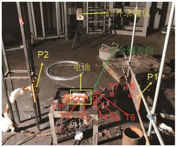 實(shí)驗(yàn)現(xiàn)場(chǎng)選擇在爆炸洞內(nèi),將樣品電池采用水平放置的方式,放置在距地面50 cm的支架上,如圖1所示。電池兩側(cè)采用夾具固定,并采用一定厚度的隔熱棉隔離電池和支架以減少熱量損失。在爆炸洞外,用計(jì)算機(jī)程序遠(yuǎn)程控制IT6522A型充放電儀(南京艾德克斯公司)測(cè)試系統(tǒng)對(duì)樣品電池做過充測(cè)試,記錄其電流電壓隨時(shí)間的變化情況。在爆炸洞外觀察孔處布置一架APX RX型高速攝影儀(日本Photron公司),記錄樣品電池的爆炸過程。采用5支直徑為2 cm、量程范圍為0~1200 ℃的K型鎧裝熱電偶(T1~T5)測(cè)量電池表面、煙氣及火焰溫度,其中T1位于電池表面中心位置;T2、T3、T4與電池上表面的距離均為5 cm;T5距離電池上表面15 cm。在距離電池安全閥約45 cm處布置2個(gè)211B6型壓力傳感器(瑞士KISTLER公司,P1~P2),測(cè)定樣品電池?zé)崾Э睾螽a(chǎn)生的壓力波。