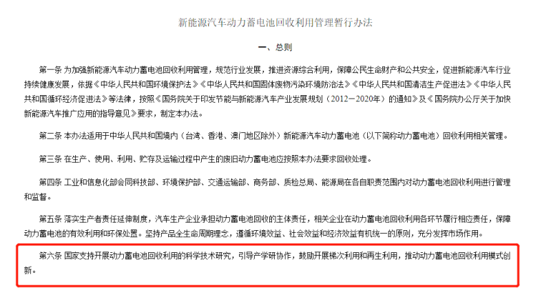 2018年,工信部等七部門曾聯(lián)合印發(fā)《新能源汽車動(dòng)力蓄電池回收利用管理暫行辦法》,強(qiáng)調(diào)了對(duì)動(dòng)力電池的梯次利用、回收網(wǎng)點(diǎn)建設(shè),并提出汽車生產(chǎn)企業(yè)承擔(dān)動(dòng)力蓄電池回收的主體責(zé)任,但究竟如何落實(shí)等并沒有相關(guān)條款,工信部正在研究制定的《新能源汽車動(dòng)力蓄電池回收利用管理辦法》或許會(huì)重點(diǎn)關(guān)注這些方面。