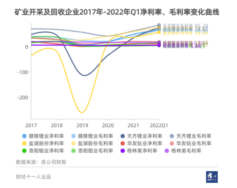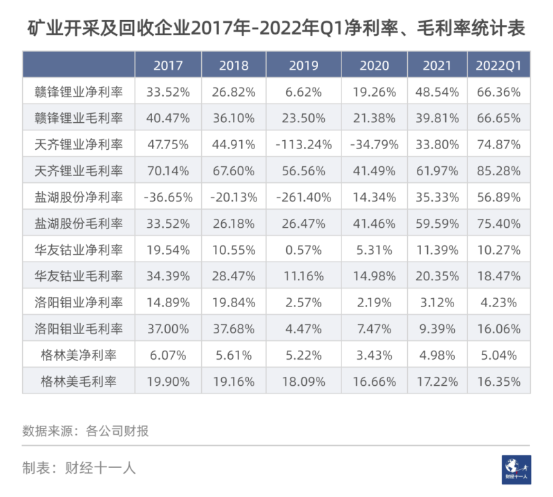 從利潤表現(xiàn)看,鋰礦企業(yè)的確收獲巨大,2022年第一季度天齊鋰業(yè)的毛利率超過85%。贛鋒鋰業(yè)的工作人員不無調(diào)侃地說:“看到了天齊的財報,就覺得以后有兄弟可以分?jǐn)偱诨鹆恕!?