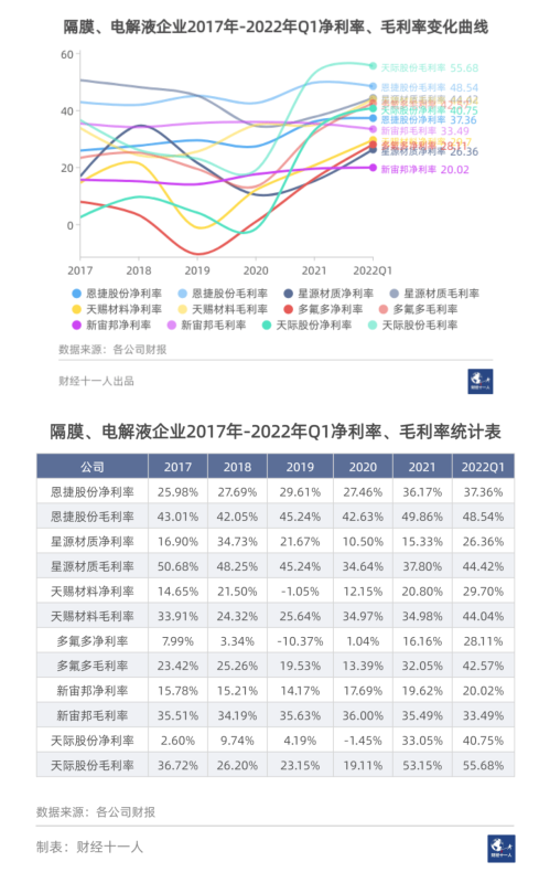 電解液是這一輪原材料價格飛漲的起點,目前看也是價格高漲的最大受益者之一。天賜、多氟多、天際、新宙邦等公司的利潤率數(shù)據(jù)都從2020年開始快速上升。但與正負(fù)極企業(yè)類似,電解液企業(yè)也在2018年開始的市場疲軟當(dāng)中受損嚴(yán)重,這兩年價格暴漲,利潤猛增對多數(shù)電解液企業(yè)來說,是在恢復(fù)元氣。