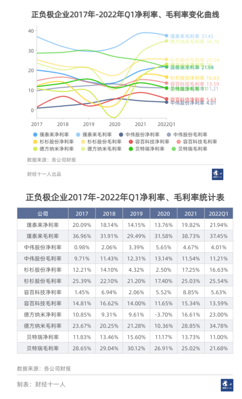 正負(fù)極是動力電池重要的上游產(chǎn)業(yè)。該產(chǎn)業(yè)在這輪動力電池市場熱潮中的收益頗豐,但這種收益是建立在此前的低起點之上的。放大到5年為周期,會發(fā)現(xiàn)2022年一季度代表性正負(fù)極企業(yè)的利潤率水平與2017年的水平基本相當(dāng)。5年時間,以2020年為最低點,正負(fù)極企業(yè)的利潤率呈現(xiàn)V形曲線。