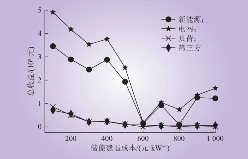 同樣,通過改變儲能建造成本,對各方收益影響進行靈敏度分析。如圖9所示,儲能建造成本的改變會影響到整個市場的競爭和投資策略,但影響并不是單調(diào)函數(shù);新能源與電網(wǎng)由于自身優(yōu)勢,市場競爭力較大。