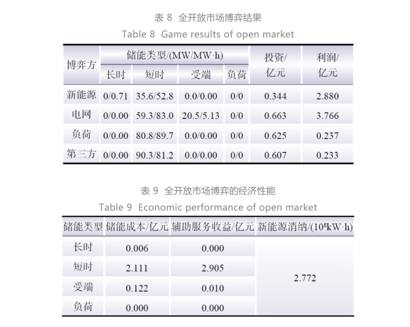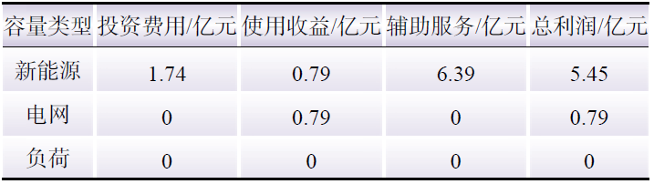 在市場全開放的商業(yè)模式中,新能源、電網(wǎng)和電力用戶同時作為儲能服務的供應者和需求者,同時還有第三方投資者加入,同時參與市場博弈,其博弈結(jié)果如表8所示,其經(jīng)濟性能如表9所示。
