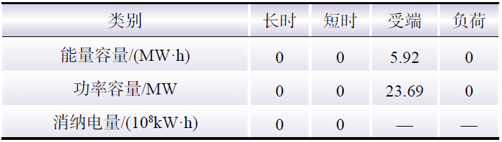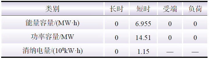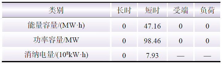 在新能源場站投資主導的商業(yè)模式中,新能源場站作為儲能服務的供應者與需求者,而電網(wǎng)與負荷只作為需求方。通過三方博弈其結(jié)果如表4所示。在目前給出的電價環(huán)境下,新能源場站傾向于建設短時儲能,而其他儲能類型受成本限制,需求無法滿足。