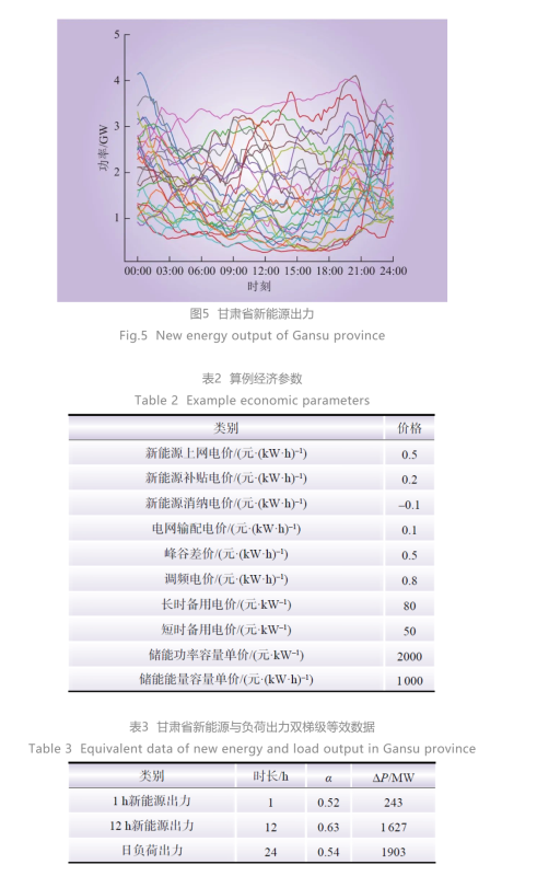 圖4和圖5為甘肅省新能源和日負荷曲線(僅顯示一個月的出力情況),其等效的雙梯級模型參數(shù)如表3所示(采用一年的數(shù)據(jù)等效)。此外,直流外送受端最大需求為1000 MW/15 min。