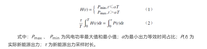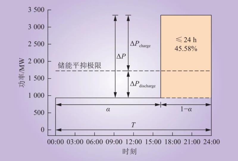 如圖1所示,由該日等效出力曲線可知,存在 1?α 的時段產(chǎn)生了高出力,若沒有任何日內(nèi)靈活性調(diào)節(jié)手段(系統(tǒng)備用、負荷響應、儲能等),整體出力只能維持在最低水平,約45.58%的能量必須拋棄。如果要消納全部電量,必須配置功率調(diào)節(jié)容量約為 ΔP 的靈活調(diào)節(jié)電源來平衡風電低出力帶來的功率缺額,而α太小會影響機組的利用效率,α 過大又會增大機組能耗。若使用儲能消納全部電量,最大須配置充放電功率分別為ΔPcharge 和 ΔPdischarge 的儲能裝置。