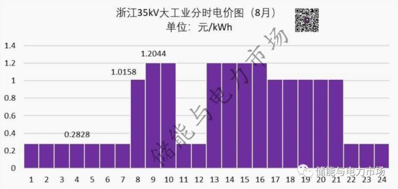 以浙江省35kV大工業(yè)用戶分時電價為例,分時電價的時段劃分,使浙江省電力用戶全天可擁有兩次低谷充電、高峰放電的機會。若配置兩小時的儲能系統(tǒng),將可以實現(xiàn)兩次尖峰放電、低谷充電操作。