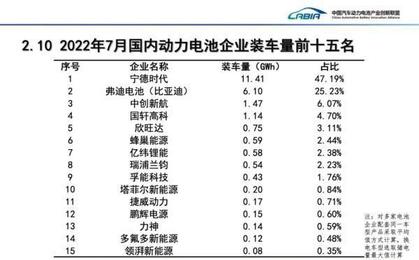 同時(shí),中國汽車動(dòng)力電池產(chǎn)業(yè)創(chuàng)新聯(lián)盟還公布了7月國內(nèi)動(dòng)力電池裝車量前15名的企業(yè)。其中,寧德時(shí)代以47.19%的占比穩(wěn)居第一,弗迪電池(比亞迪)、中創(chuàng)新航、國軒高科、欣旺達(dá)分別以25.23%、6.07%、4.70%、3.11%的占比位居2-5位。此外,6至15位依次是蜂巢能源、億緯鋰能、瑞浦蘭鈞、孚能科技、塔菲爾新能源、捷威動(dòng)力、鵬輝電源、力神、多氟多新能源、領(lǐng)湃新能源。