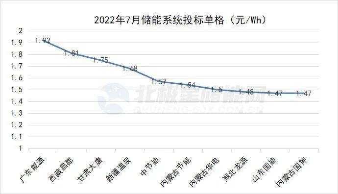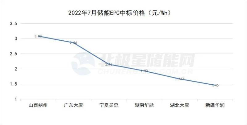 其中山西應縣獨立儲能項目EPC招標中,湖北省電力勘測設計院有限公司、中國電建集團江西省水電工程局有限公司聯(lián)合體投標報價3.07元/Wh,是七月份已知最高報價。