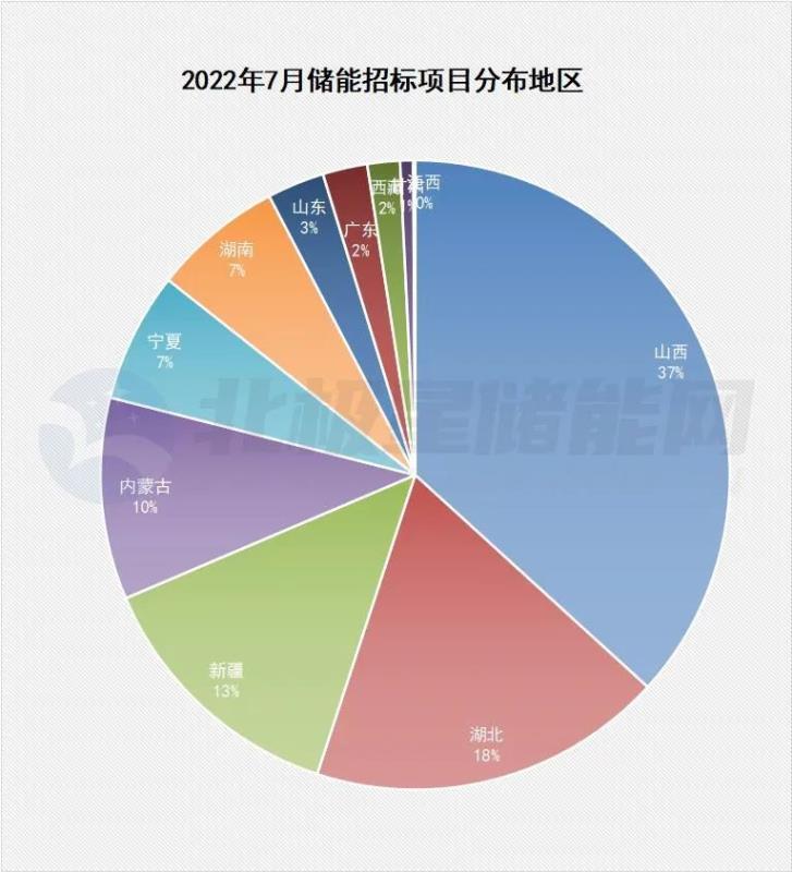 2022年7月,共有38個儲能項目開標、總規(guī)模約3.09GWh。從地域來看,43個項目分布于山西、寧夏、湖北、內蒙古、甘肅、河南等12省區(qū)。其中山西儲能項目采購規(guī)模最大,共計4個儲能項目總規(guī)模超700MW/1100MWh。