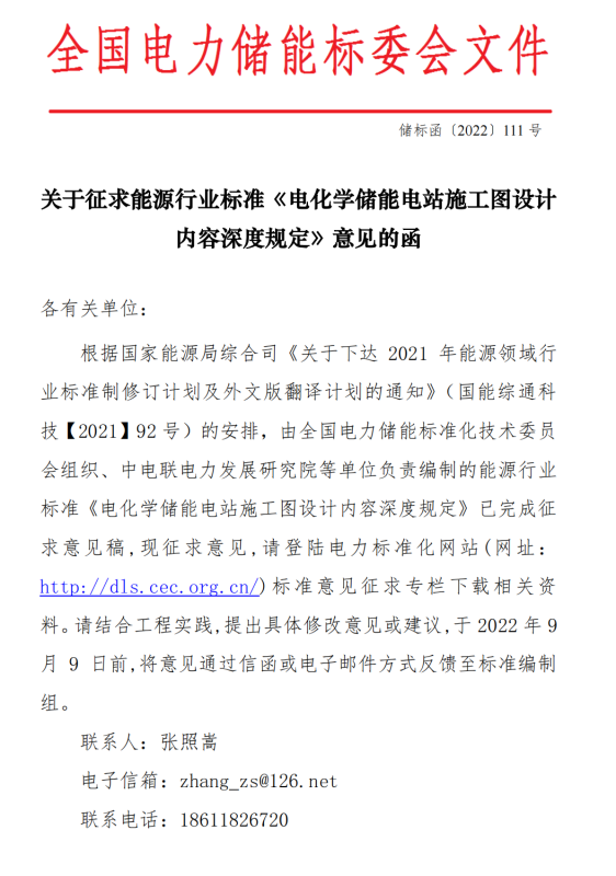 關(guān)于征求能源行業(yè)標(biāo)準(zhǔn)《電化學(xué)儲能電站施工圖設(shè)計內(nèi)容深度規(guī)定》意見的函