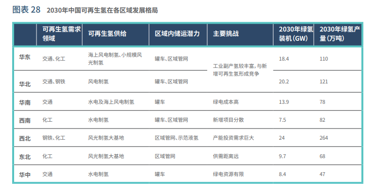 根據(jù)分析,華東和華中地區(qū)在2030年分別需要建設(shè)18.4GW和8.4GW的電解槽,并分別達(dá)到110和47萬噸/年的可再生氫產(chǎn)量。