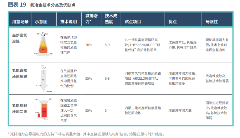 鋼鐵行業(yè)對可再生氫的利用集中在新增產(chǎn)能生產(chǎn)工藝流程,行業(yè)領(lǐng)先企業(yè)占據(jù)先發(fā)地位。根據(jù)不同煉鐵工藝,氫冶金的主要應(yīng)用場景可分為三類,如圖表19所示。