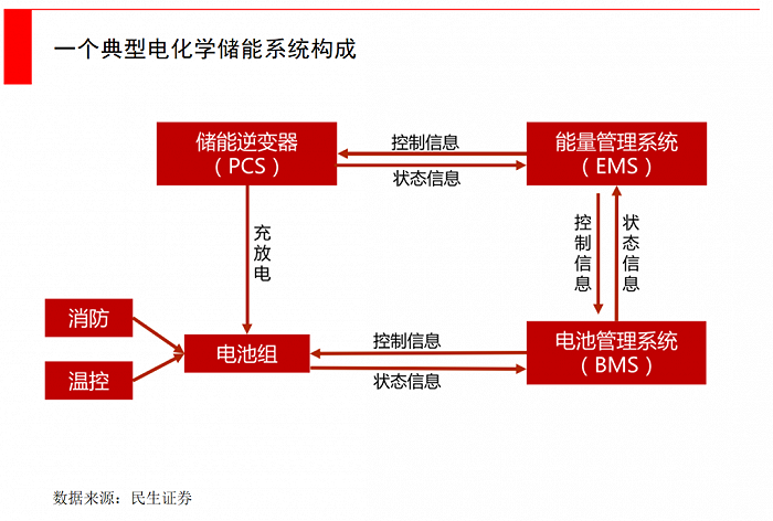 一套典型的儲(chǔ)能電池系統(tǒng),主要包括了電池、PCS變流器、BMS 電池管理系統(tǒng)、EMS溫控系統(tǒng)等核心環(huán)節(jié)。