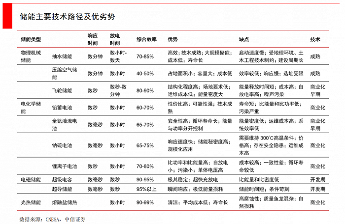 雖然儲(chǔ)能技術(shù)路徑眾多,但除了抽水蓄能與電化學(xué)儲(chǔ)能外,其他路徑無論在成本還是技術(shù)成熟度上,都還不足以大規(guī)模商業(yè)化,很多仍處于小規(guī)模實(shí)驗(yàn)性階段。