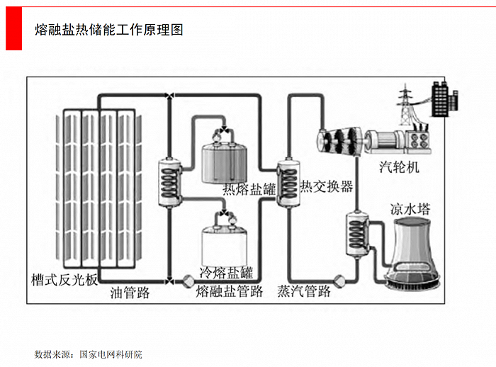 熔融鹽儲(chǔ)能:目前占比還很小。熔融鹽是將鹽升溫到熔點(diǎn)之后,形成的一種熔融態(tài)液體,基本都是由無機(jī)鹽構(gòu)成的熔融體。工作原理是將多余電能,把熔鹽的溫度增至500 ℃,再存貯至高溫熔鹽罐中,到用電高峰再把高溫熔鹽從罐內(nèi)取出,在熔鹽換熱器內(nèi)實(shí)現(xiàn)熱量轉(zhuǎn)換來對水與空氣進(jìn)行加熱,釋放熱能進(jìn)行使用。與過去的高溫導(dǎo)熱介質(zhì)相比,熔融鹽的高溫穩(wěn)定性比較好。這種方式主要用于冬季供暖。
