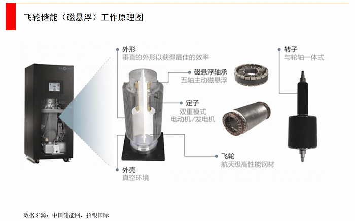 飛輪儲(chǔ)能:目前是一個(gè)研究重點(diǎn),但應(yīng)用場景較小。飛輪儲(chǔ)能是通過低摩擦環(huán)境中,高速旋轉(zhuǎn)的轉(zhuǎn)子來存儲(chǔ)動(dòng)能。在“充電”時(shí),電動(dòng)機(jī)會(huì)發(fā)動(dòng)將飛輪加速,將電能轉(zhuǎn)化為機(jī)械能儲(chǔ)存;當(dāng)需要用電時(shí),飛輪轉(zhuǎn)速下降,透過發(fā)電機(jī)將機(jī)械能轉(zhuǎn)化為電能給外部供電。整個(gè)飛輪儲(chǔ)存裝置是在封閉殼體中,一般是通過磁懸浮技術(shù)或真空環(huán)境,以減少阻力,保護(hù)轉(zhuǎn)子系統(tǒng)高速運(yùn)轉(zhuǎn)。飛輪儲(chǔ)能的優(yōu)點(diǎn)是能量轉(zhuǎn)換效率高(高達(dá)90%),響應(yīng)速度快(適合于電網(wǎng)調(diào)頻場景),但缺點(diǎn)也非常明顯,可容納電量比較少,并且造價(jià)很高,還面臨很多技術(shù)性難題,比如怎么設(shè)計(jì)高強(qiáng)度飛輪轉(zhuǎn)子?如何設(shè)計(jì)制造復(fù)合軸承?真空狀態(tài)下的電機(jī)及軸承如何高效冷卻?……