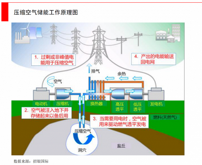 壓縮空氣儲(chǔ)能:目前體量還非常小,它的工作邏輯是在用電低谷期,把過剩電能將空氣壓縮至高壓,存到儲(chǔ)氣室中,也就是將電能轉(zhuǎn)化為空氣內(nèi)能儲(chǔ)存起來。當(dāng)需要用電時(shí),高壓空氣從儲(chǔ)氣室釋放進(jìn)入燃燒室,利用燃料燃燒加熱升溫后,驅(qū)動(dòng)燃?xì)馔钙桨l(fā)電。在實(shí)際應(yīng)用中,為了節(jié)約儲(chǔ)氣室的建設(shè)成本,經(jīng)常是去尋找礦洞來作為天然的儲(chǔ)氣室,這也會(huì)受制于地理結(jié)構(gòu)。壓縮空氣的能效比較低,只有65-75%。截至2021年底,壓縮空氣儲(chǔ)能在全球新型儲(chǔ)能裝機(jī)規(guī)模中,占比為2.3%,商業(yè)推廣目前比較少。