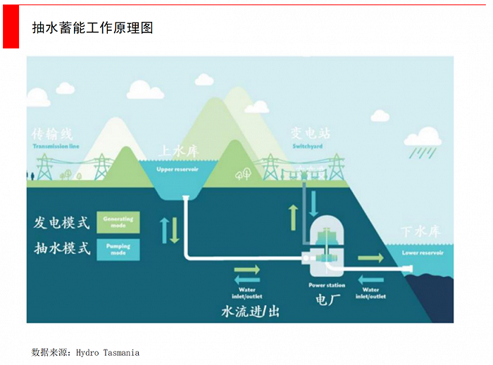 歷史最為悠久、技術(shù)最為成熟的儲(chǔ)能方式是抽水蓄能。它其實(shí)非常簡單,就是把多余的電力輸入抽水機(jī)組,利用水壩的高低差,把水從低位抽到高位。當(dāng)需要用電時(shí),再開閘放水發(fā)電。它所能儲(chǔ)備的電量非常大。