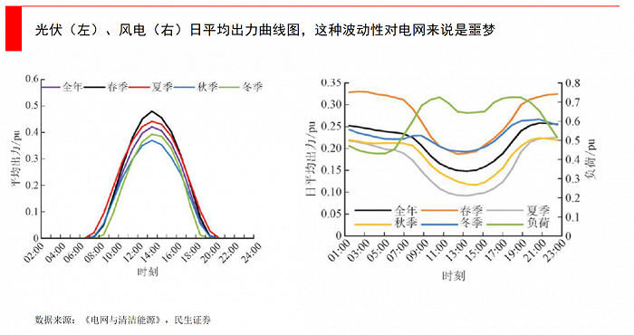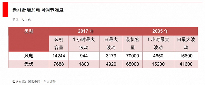 根據(jù)國家電網(wǎng)的測算,2035年前,風(fēng)、光裝機(jī)規(guī)模分別將達(dá)到7億、6.5億千瓦,全國風(fēng)電、太陽能日最大波動(dòng)率預(yù)計(jì)分別達(dá)1.56億、4.16億千瓦,大大超出目前調(diào)節(jié)能力,迫切需要重新構(gòu)建調(diào)峰體系,以具備應(yīng)對新能源5億千瓦左右的日功率波動(dòng)的調(diào)節(jié)能力。