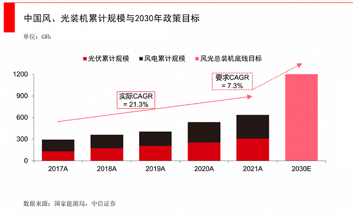 國內(nèi)儲(chǔ)能的大爆發(fā),來源于政策變化。在碳中和、提升能源自給率的大背景下,國家能源局在《關(guān)于2021年風(fēng)電、光伏發(fā)電開發(fā)建設(shè)有關(guān)事項(xiàng)的通知》中,計(jì)劃2030年風(fēng)電光伏裝機(jī)總?cè)萘繉⑦_(dá)到12億千瓦,而截至2020年底,風(fēng)光總量不過6.3億千瓦,這一目標(biāo)意味著在未來10年中,風(fēng)電與光伏要各新增3億千瓦。