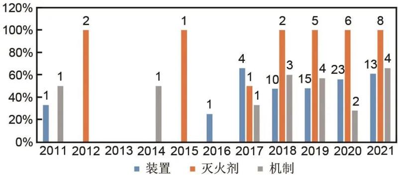 圖4 儲(chǔ)能系統(tǒng)消防各領(lǐng)域發(fā)明專利年申請(qǐng)量及占比