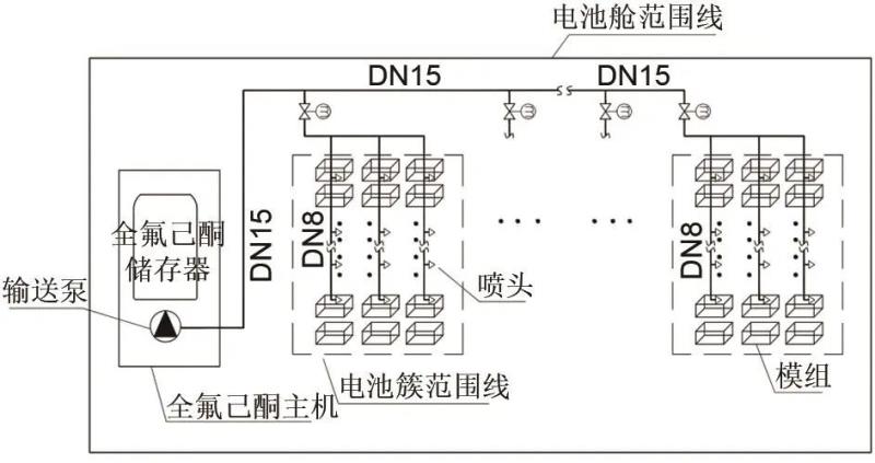 基于模型試驗結(jié)論,結(jié)合本工程儲能電池艙布置及實際凈空間,每座儲能電池預(yù)制艙設(shè)置1套全氟己酮氣體滅火系統(tǒng)(圖9),該系統(tǒng)由全氟己酮主機(包括存儲裝置、輸送裝置、控制系統(tǒng)等)、分區(qū)控制閥、管網(wǎng)和霧化噴頭等組成。全氟己酮滅火劑采用泵組輸送,主管為DN15的鍍鋅鋼管,支管采用DN8軟管,每個電池簇設(shè)置1只分區(qū)控制閥(電動球閥)及3根支管,每根支管設(shè)置4只噴頭,每個電池簇共計12只噴頭。經(jīng)過溫度、海拔修正后,滅火劑量設(shè)計取值90 L,其對應(yīng)滅火濃度與模型試驗相應(yīng)濃度相當。