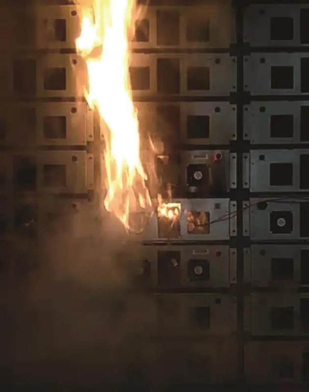 儲能電池艙是化學儲能電站主要設(shè)備,一般利用標準集裝箱建造,箱內(nèi)設(shè)置數(shù)百塊磷酸鐵鋰電池模組;每塊電池模組由幾十只單體電池組成(圖1);按電氣接線,數(shù)十塊電池模組組成一個電池簇。儲能電池艙內(nèi)的磷酸鐵鋰電池在過充、過載等條件下,電池內(nèi)部發(fā)生化學反應(yīng)而不斷產(chǎn)熱,熱量聚集致熱失控引起火災(zāi)甚至爆炸,具有較大的火災(zāi)危險性。研究成果表明磷酸鐵鋰電池的火災(zāi)危險性主要體現(xiàn)在:①發(fā)生熱失控的溫度較低(約140 ℃);②在熱失控過程產(chǎn)生大量可燃氣體,在儲能電池艙(密閉空間)內(nèi)具有爆炸風險;③電池燃燒溫度較高,電池模組燃燒時最高溫度可達700 ℃以上,而簇級電池燃燒時最高溫度則超過1000 ℃;④儲能電池艙布置了數(shù)量眾多的單體電池(1座儲能電池艙最多可放置約1萬只單體電池),其火災(zāi)隱患與單體電池數(shù)量成正比??偨Y(jié)各方研究成果:適用于撲滅磷酸鐵鋰電池火災(zāi)的滅火劑最重要的特征是其在迅速滅火的同時還具有較強的持續(xù)冷卻能力,水基滅火劑具有良好的冷卻效能,可有效抑制鋰電池熱失控,是較好的滅火介質(zhì),也是一般采用的終極滅火措施。但水基滅火劑可能存在水漬影響引起磷酸鐵鋰電池發(fā)生次生危害,且水基滅火系統(tǒng)(如細水霧滅火系統(tǒng))在高寒地區(qū)平時的防凍壓力較大。全氟己酮滅火劑具備良好的火災(zāi)抑制能力,不會對保護對象產(chǎn)生危害、損害作用,優(yōu)點較為突出,但對其是否適用于撲滅儲能鋰電池火災(zāi)并抑制其熱失控尚有爭議,且相關(guān)設(shè)計規(guī)范缺乏。