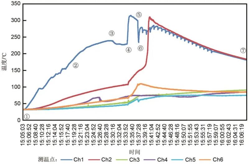 圖5 電池模組(箱)火災(zāi)試驗溫度曲線