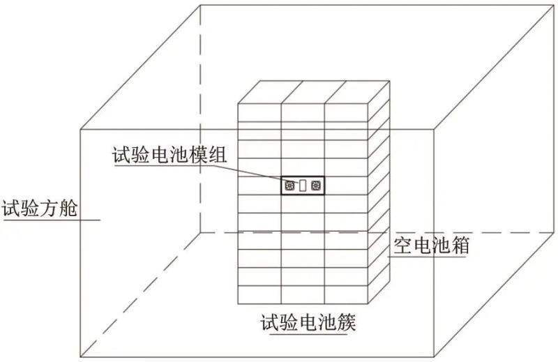 結(jié)合黃強等、王銘民等的試驗經(jīng)驗,采用“局部應(yīng)用”與“全淹沒”相結(jié)合的滅火模式。考慮噴頭、探測器布置的可行性及經(jīng)濟性,以1個電池簇為局部應(yīng)用單位,整個儲能電池艙為全淹沒滅火系統(tǒng)對象。擬將1個磷酸鐵鋰電池簇模型放置于1個相對密閉的空間,引燃1塊單體電池,初期通過快速注入全氟己酮滅火劑,以撲滅磷酸鐵鋰電池明火,后通過有規(guī)則地斷續(xù)注入全氟己酮滅火劑以維持局部及整艙空間內(nèi)一定的滅火劑濃度,抑制其熱失控。
