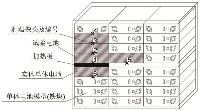 試驗所用電池簇模型均采用全尺寸模型,包括:單體鋰電池選用容量為150 Ah的方形磷酸鐵鋰電池(產(chǎn)品實體),外形尺寸為174 mm×170 mm×48 mm;試驗用電池模組(電池箱)模型尺寸為655 mm×510 mm×190 mm,內(nèi)部布置如圖3所示,其中實體電池5塊,其余位置為等尺寸模型替代;電池簇模型尺寸為1781 mm×658 mm×2369 mm。電池簇中,除試驗電池模組外,實際工況擺放的其他電池模組均為空箱,見圖4。將電池簇模型放置于儲能電池試驗方艙內(nèi),儲能電池試驗方艙尺寸為3500 mm×2450 mm×3200 mm,見圖3~4。選定某塊單體電池為試驗電池,在其下部安裝加熱設(shè)備,并在試驗電池周圍布置多個測溫裝置,監(jiān)測相鄰位置處電池的溫度和電池箱內(nèi)溫度,見圖3。全氟己酮滅火劑通過6只霧化噴頭注入,霧化噴頭布置在電池簇后側(cè)。