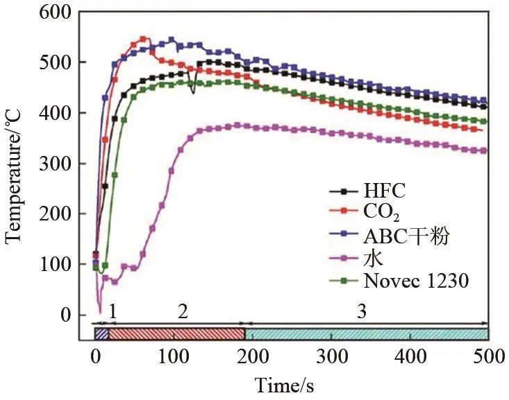 劉昱君等研究了全氟己酮對38 Ah三元鋰離子電池火災(zāi)的抑制效果,研究結(jié)果顯示全氟己酮滅火劑能快速熄滅電池明火,其抑制溫升效果僅次于水基滅火劑,優(yōu)于HFC、ABC干粉。各類滅火劑對三元鋰離子電池火災(zāi)的抑制能力見圖2。張煒鑫等采用32650磷酸鐵鋰圓柱鋰電池(3并2串)進行滅火及降溫能力測試,以全氟己酮為核心,搭配降溫劑和防腐材料開發(fā)出了一種鋰離子電池專用滅火劑。實驗結(jié)果表明,該滅火劑具有10 s撲滅明火能力,并可實現(xiàn)電池降到室溫時間小于15 s,72 h無復燃。