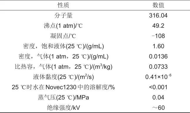 全氟己酮滅火劑常溫下是一種透明、無色、絕緣的液體,是哈龍和HFCs類滅火劑的優(yōu)良替代品,最先由美國3M公司研制開發(fā),商標為Novec1230,主要參數(shù)見表1。全氟己酮是以物理吸熱為主的潔凈氣體滅火劑,具有較高熱容量,在合適的濃度下,滅火劑釋放后與空氣形成氣態(tài)混合物,吸收足夠多熱量,使環(huán)境溫度降到熄滅溫度點以下[9]。此外全氟己酮含氟滅火劑受熱易發(fā)生脫HF反應(yīng)、C—C鍵斷裂反應(yīng),產(chǎn)生CF3、CF2、CFO等自由基可以捕捉、消耗火焰中的自由基,中斷燃燒鏈式反應(yīng)。