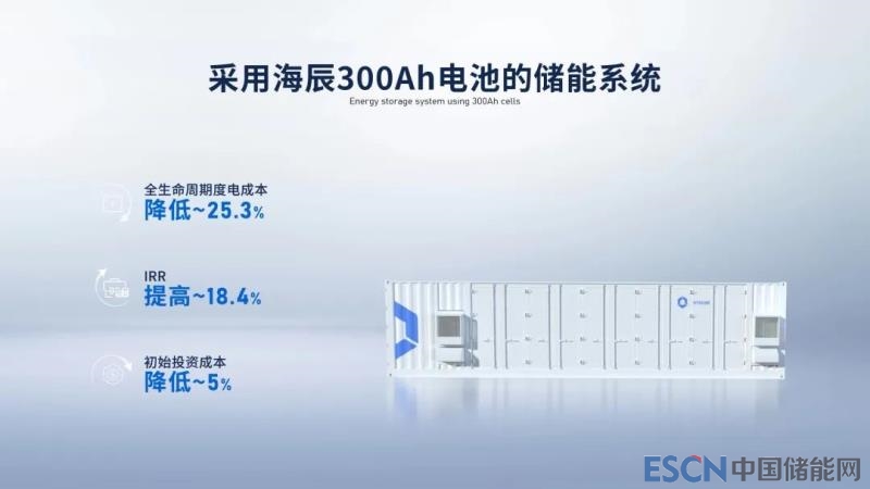 采用海辰儲能300Ah電力儲能專用電池的儲能系統(tǒng),相較當下280Ah儲能電池,可以實現(xiàn)全生命周期度電成本降低25.3%;如果以用戶側(cè)儲能電站,按照一天一充應(yīng)用場景下,可實現(xiàn)IRR(內(nèi)部收益率)提高18.4%;前三年儲能系統(tǒng)總放電量增加5%,從而減少電量超配,實現(xiàn)初始投資節(jié)省5%。該款產(chǎn)品從以上三個方面帶來顯著收益,縮短儲能項目回本周期,大幅提升投資回報率。