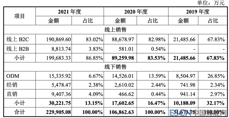 從公司的銷售渠道來(lái)看,公司目前的銷售以線上電商為主,公司主要通過(guò)亞馬遜、日本樂(lè)天、日本雅虎、天貓及京東等國(guó) 內(nèi)外知名第三方電商平臺(tái)銷售產(chǎn)品,報(bào)告期內(nèi)公司通過(guò)電商平臺(tái)開(kāi)展的線上銷售的銷售額占主營(yíng)業(yè)務(wù)收入比重分別為 67.83%、85.53%和 86.85%。