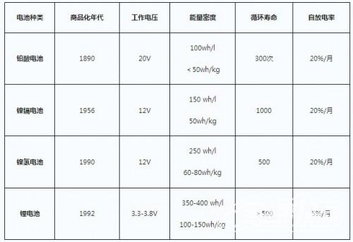 二次電池性能參數比較表