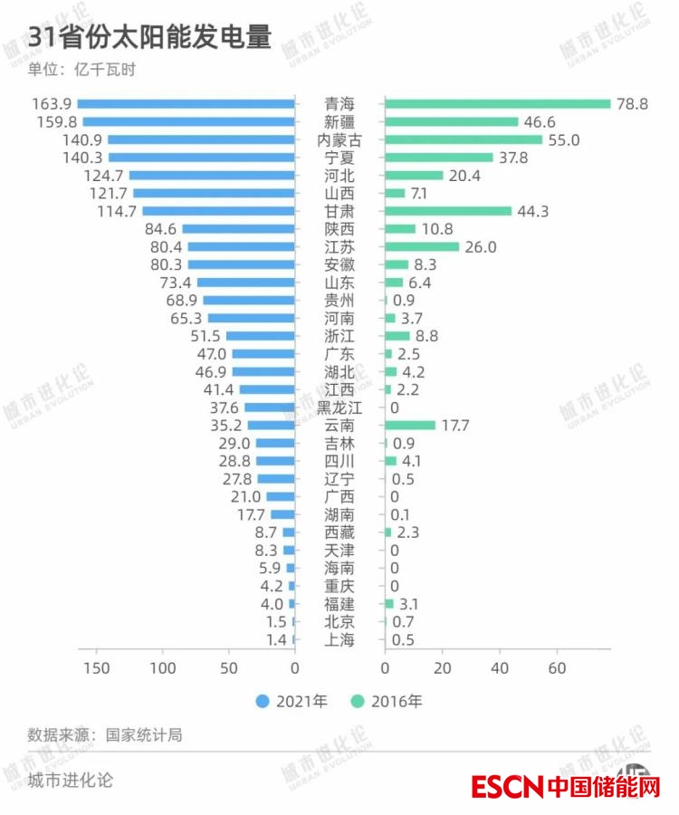 同年,太陽(yáng)能發(fā)電量的前八名無(wú)一例外均被三北地區(qū)省份包攬,除青海居于第一外,新疆、內(nèi)蒙古再次進(jìn)入前三。