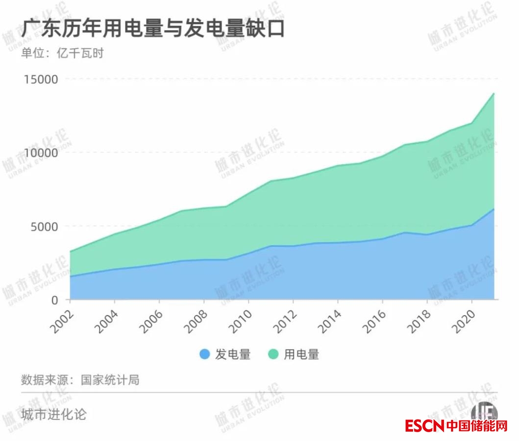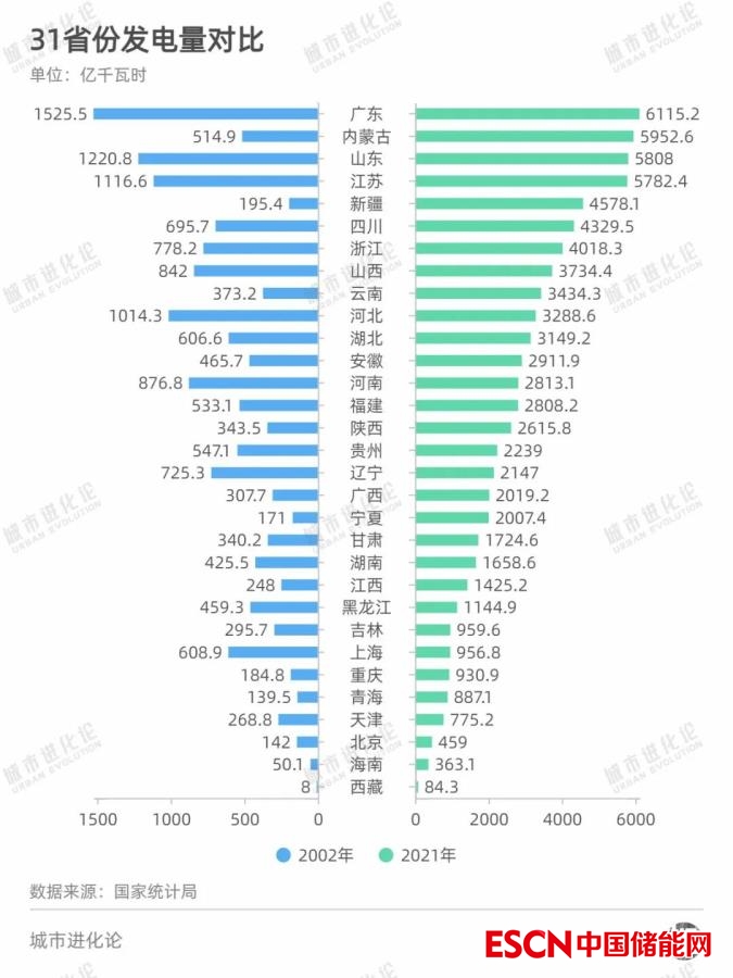 數(shù)據(jù)顯示,2002年,廣東的發(fā)電量全國(guó)第一,為1525.5億千瓦時(shí),與云貴川三省發(fā)電量總和(1616億千瓦時(shí))相差不大;到了2021年,廣東以6115.2億千瓦時(shí)發(fā)電量排名全國(guó)第一,而云貴川三省發(fā)電量已增至10002.8億千瓦時(shí)。