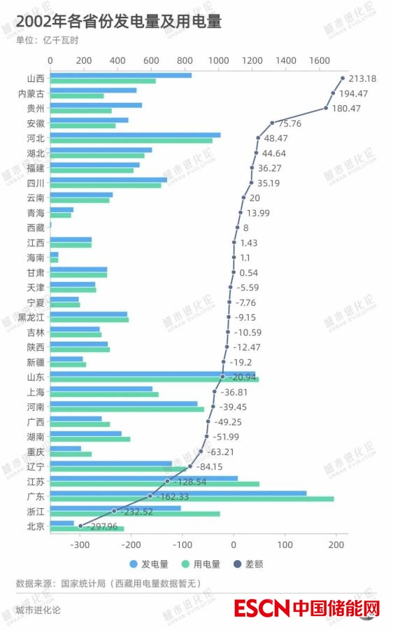 不僅如此,2002年,除廣東外,山東、江蘇、河北的發(fā)電量也均超過(guò)1000億千瓦時(shí);其后是河南(876.8億千瓦時(shí))、山西(842億千瓦時(shí))、浙江(778.2億千瓦時(shí))和遼寧(725.3億千瓦時(shí))——彼時(shí),廣大西部地區(qū)的電力資源還有待開(kāi)發(fā)。