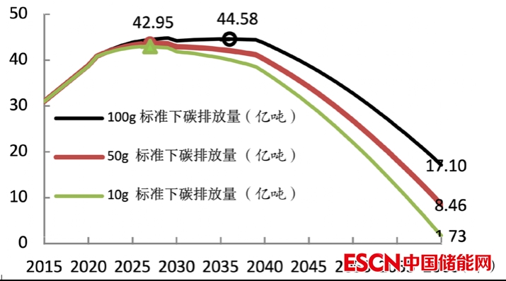 電力行業(yè)要達(dá)到“準(zhǔn)零碳排放”標(biāo)準(zhǔn),碳排放總量要比 2020 年減少 30 億噸。從發(fā)展過(guò)程來(lái)看, 50克/千瓦時(shí)的標(biāo)準(zhǔn)可以促使電力行業(yè)在 2027 年左右達(dá)峰,峰值排放量達(dá)到 42.95 億噸,如圖2。若以 100克/千瓦時(shí)的排放標(biāo)準(zhǔn),碳達(dá)峰時(shí)間大約在 2037 年,后續(xù)的碳中和目標(biāo)實(shí)現(xiàn)壓力很大。