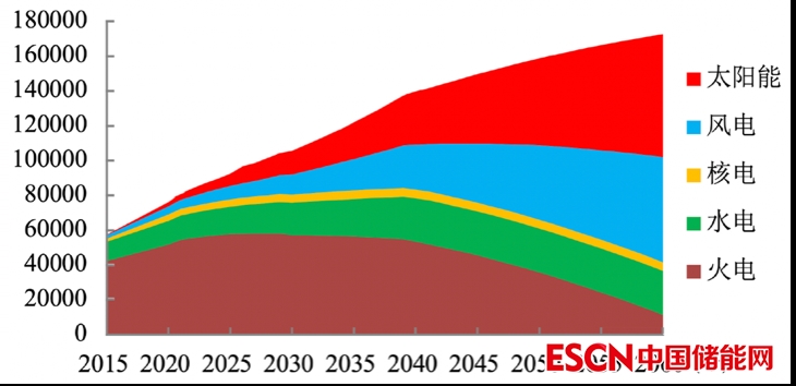 在碳達(dá)峰至碳中和期間,電力生產(chǎn)總量是增加的,年均增長(zhǎng)率 2.1%~2.3%。2015年至2060 年,全國(guó)電力生產(chǎn)總量,以及火電、水電、核電、 風(fēng)電和太陽(yáng)能發(fā)電量變化趨勢(shì)如圖 1。