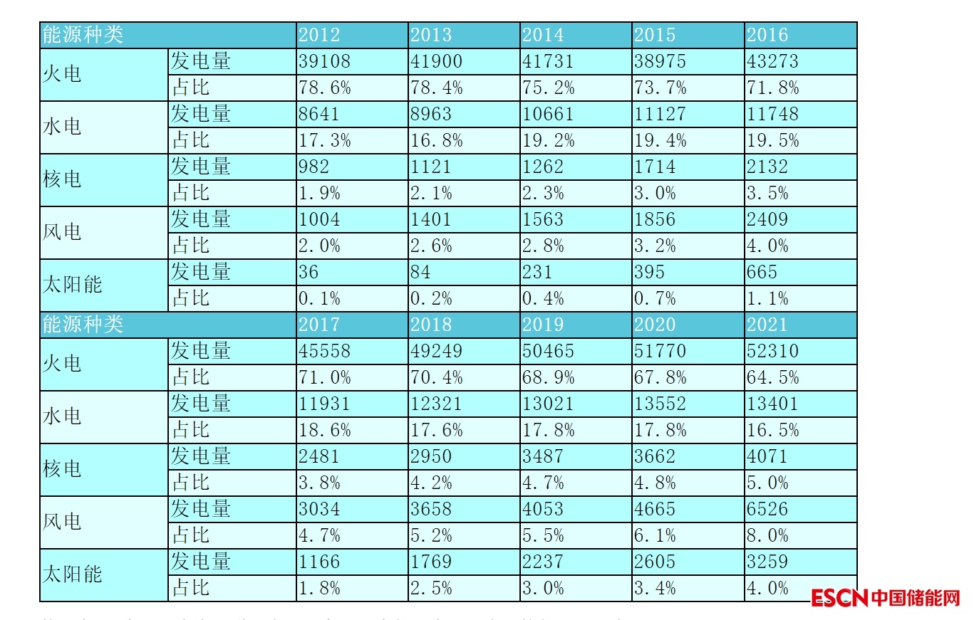 表1 2012-2021年我國(guó)能源發(fā)電量與占比 單位:億千瓦時(shí)