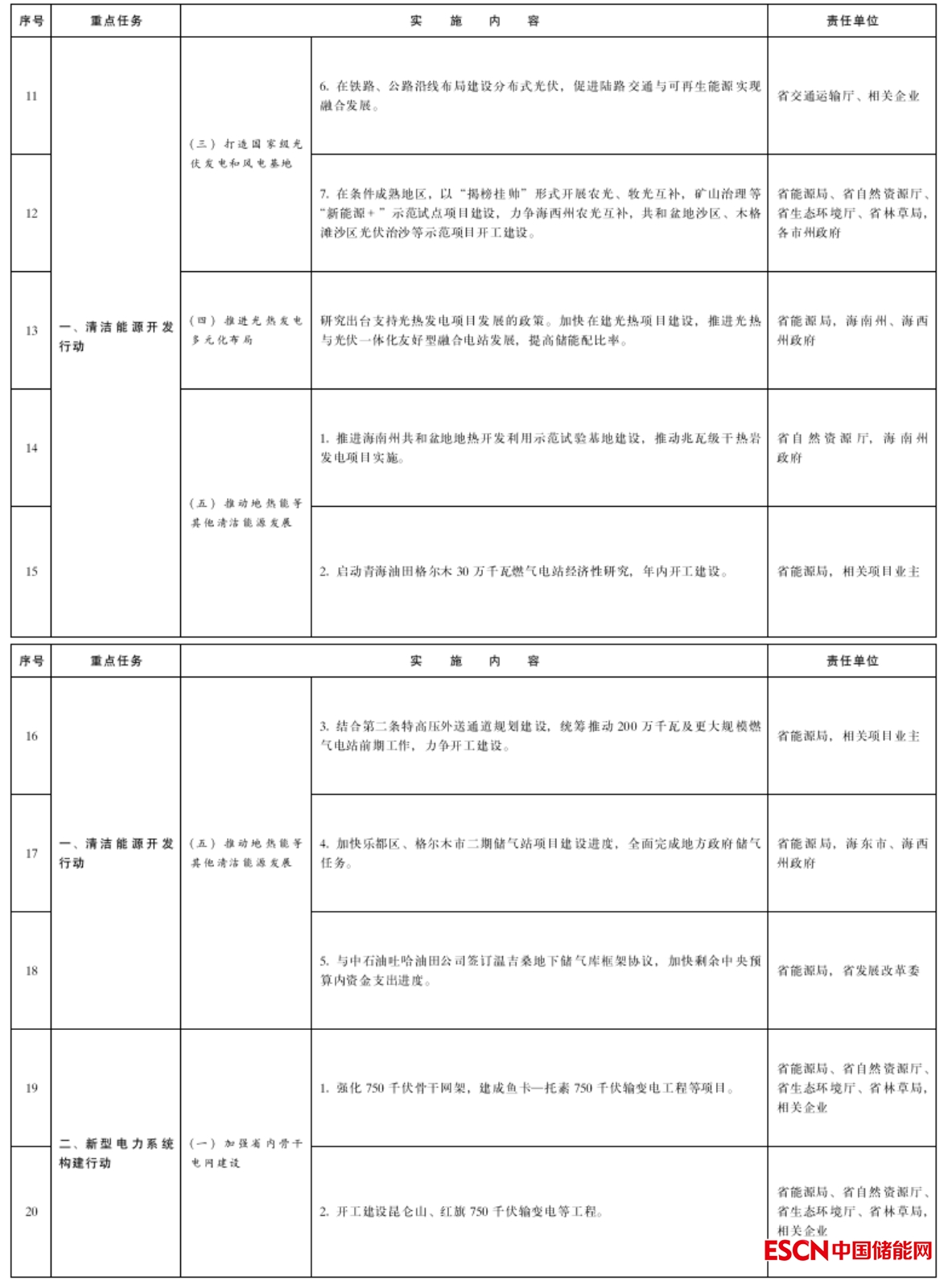 (三)發(fā)展新型儲能。按照“統(tǒng)一規(guī)劃、統(tǒng)一建設(shè)、統(tǒng)一調(diào)度、統(tǒng)一運(yùn)營”原則,制定《新能源側(cè)儲能電站規(guī)劃布局方案》,力爭開工建設(shè)大規(guī)模電化學(xué)共享儲能示范項目,投運(yùn)10萬千瓦/20萬千瓦時共享儲能電站。(省能源局,海西州政府)以“揭榜掛帥”形式開展空氣壓縮儲能、熔鹽儲能等試點(diǎn)示范項目建設(shè)。(省能源局,各市州政府)全面推進(jìn)第一批大基地配套儲能項目建設(shè)。(省能源局,海南州、海西州政府)