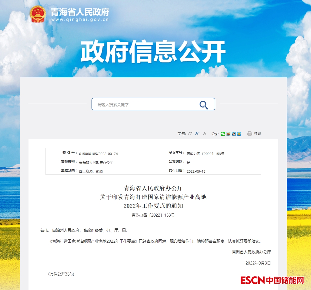 文件指出,2022年6月8日印發(fā)的《青海省人民政府辦公廳關(guān)于印發(fā)青海打造國家清潔能源產(chǎn)業(yè)高地2022年工作要點(diǎn)的通知》(青政辦函〔2022〕74號)同步作廢。
