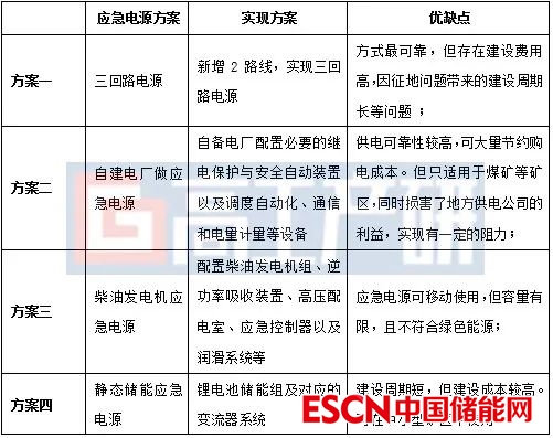 礦區(qū)應急電源的選型要依據(jù)礦區(qū)的實際情況,從安全性、經(jīng)濟性、實用性、可靠性等多各方面考慮,確保備用電源真正起到作用。目前國內(nèi)礦區(qū)使用的備用電源類型主要包括引入第三電源、自備電廠、靜態(tài)儲能、車載柴油發(fā)電機四種形式。
