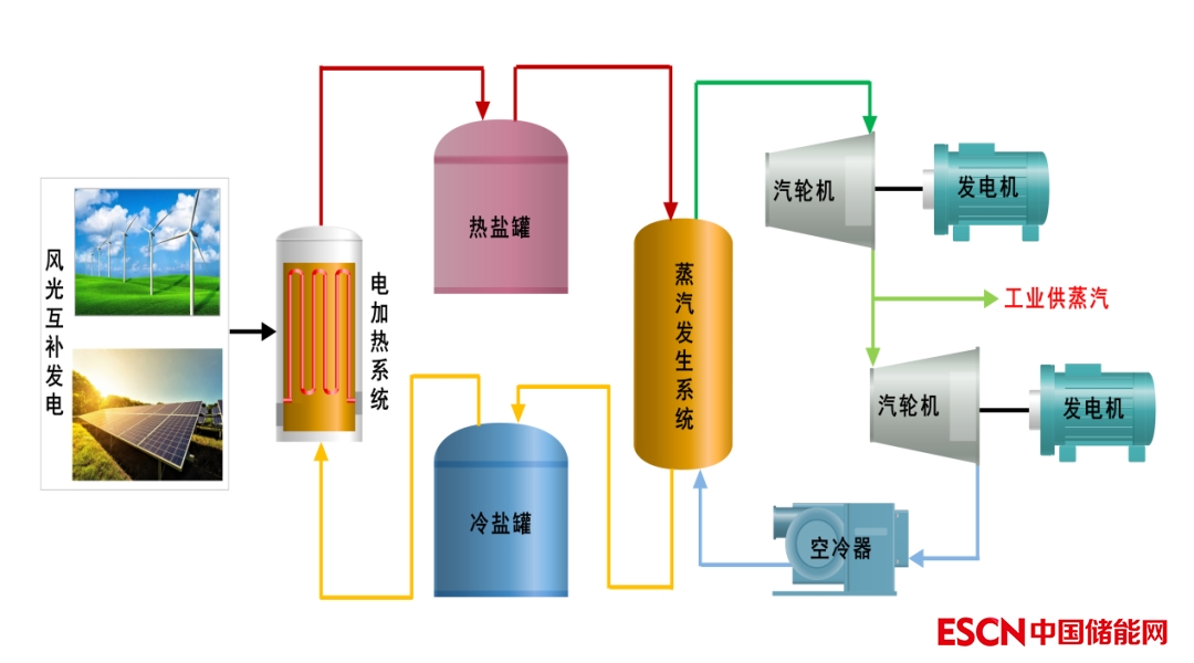 該項目可利用西部地區(qū)的風(fēng)電、光伏等可再生能源電力或廉價谷電,通過熔鹽電加熱系統(tǒng)加熱熔鹽,實現(xiàn)儲能,存儲的熱量可通過蒸汽發(fā)生系統(tǒng)產(chǎn)生蒸汽,推動汽輪發(fā)電機(jī)再次輸出持續(xù)、穩(wěn)定的電能,同時輸出工業(yè)蒸汽。