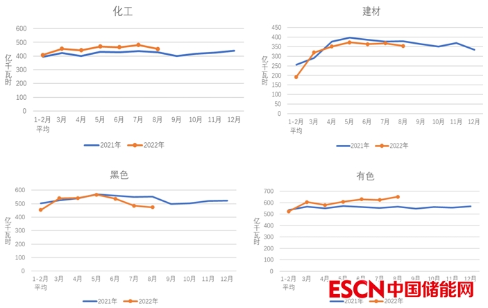 1-8月,化工行業(yè)用電量3621億千瓦時,同比增長4.9%;建材行業(yè)用電量2597億千瓦時,同比下降4.7%;黑色金屬冶煉行業(yè)用電量4095億千瓦時,同比下降5.6%;有色金屬冶煉行業(yè)用電量4927億千瓦時,同比增長2.6%。